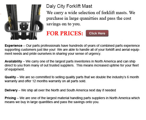 Daly City Forklift Masts - Called the "Gateway to the Peninsula", Daly City is located on San Mateo County's northern edge. The limits of the city stretch from the Pacific Ocean on the west all the way to the San Francisco Bay, which is east of the city. It is conveniently located in the middle of two of the largest job growth zones within California, the San Francisco and San Mateo counties. Though the financial system within the area is very diverse, the main sectors are in small business, retail and healthcare.